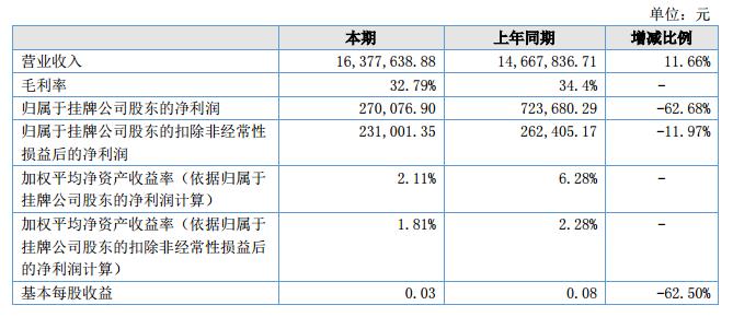報(bào)告期內(nèi)實(shí)現(xiàn)銷售收入1,637.76萬元,較去年同期增長(zhǎng)11.66%,增長(zhǎng)原因?yàn)楣旧弦荒甓人e累開發(fā)的新客戶訂單穩(wěn)步增長(zhǎng)所致;報(bào)告期毛利率為32.79%,比去年同期下降4.68個(gè)百分點(diǎn),主要是除油清洗劑毛利比去年同期下降11.64%以及公司采購原材料為石油衍生品,平均采購價(jià)格對(duì)比上年度增長(zhǎng)10%所致;報(bào)告期內(nèi)實(shí)現(xiàn)凈利潤(rùn)27萬元,比去年同期下降了62.68%,主要原因?yàn)楣旧弦荒甓忍幹霉潭ㄙY產(chǎn)收益53萬元所致。?