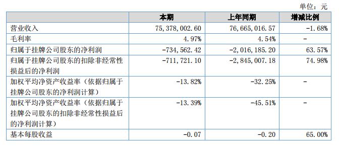報(bào)告期內(nèi),公司實(shí)現(xiàn)營(yíng)業(yè)收入75,378,002.60元,較上年同期下降-1.68%;營(yíng)業(yè)成本71,628,350.87元,較上年同期下降-2.12%。主要原因:公司業(yè)務(wù)保持跟上年同期一致。報(bào)告期內(nèi)營(yíng)業(yè)成本變動(dòng)趨勢(shì)與收入變動(dòng)趨勢(shì)一致。報(bào)告期內(nèi),公司毛利率為4.97%,較上年同期提高了0.43個(gè)百分點(diǎn)。主要原因:報(bào)告期內(nèi),隨著公司與供應(yīng)商的合作程度不斷加深,且付款逐漸采用預(yù)付方式,使得采購(gòu)價(jià)同比上年同期有所下降,但同期銷售價(jià)格與去年同期基本持平,造成公司銷售毛利率上升。報(bào)告期內(nèi),公司實(shí)現(xiàn)凈利潤(rùn)-734,562.42元,較上年同期上升63.57%,其中扣除非經(jīng)常性損益后歸的凈利潤(rùn)為-711,721.10元,較上年同期上升74.98%。?