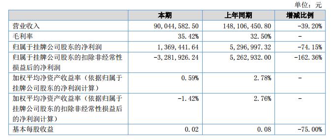報告期內(nèi),公司實現(xiàn)營業(yè)收入90,044,582.50元,相比上年同期下降39.20%;營業(yè)成本為96011929.89元,相比上年同期下降34%;實現(xiàn)凈利潤1,369,441.64元,相比上年下降74.15%。凈利潤相較去年同期下降由于公司整體仍處于業(yè)務轉型期所導致。