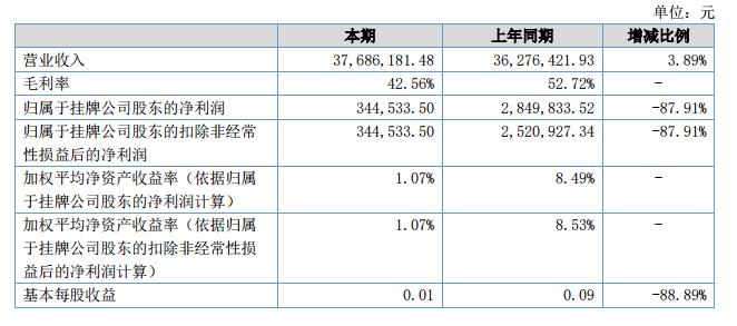 報告期內,實現(xiàn)銷售收入3768.62萬元,同比上升了3.89%;實現(xiàn)凈利潤為34.45萬元,同比下降87.91%。?