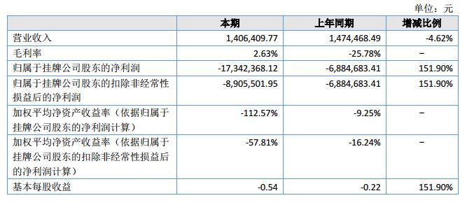 報告期內(nèi)公司實(shí)現(xiàn)營業(yè)收入1,406,409.77元,比上年同期減少4.62%;截至2018年6月30日,公司總資產(chǎn)為63,162,185.02元,凈資產(chǎn)為6,734,271.07元,同比下降10.87%和72.03%。報告期,歸屬于掛牌公司股東的凈利潤為-17,342,368.12元,同比下降151.96%。?