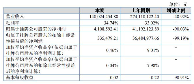 報(bào)告期內(nèi),公司實(shí)現(xiàn)營(yíng)業(yè)收入140,024,454.88元,同比下降48.92%;歸屬于母公司所有者的凈利潤(rùn)4,108,592.41元,同比下降90.03%;歸屬于母公司所有者的扣除非經(jīng)常性損益后的凈利潤(rùn)335,479.21元,同比下降99.19%。截至2018年06月30日,歸屬于母公司所有者凈資產(chǎn)897,179,721.37元,同比上升0.46%。?