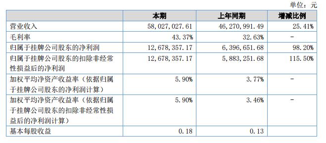 2018年上半年,公司實(shí)現(xiàn)營業(yè)收入5802.70萬元,同比增長25.41%;實(shí)現(xiàn)的凈利潤為1313.40萬元,同比增加96.89%,歸屬于掛牌公司股東的凈利潤為1267.84萬元,同比增加98.20%。?