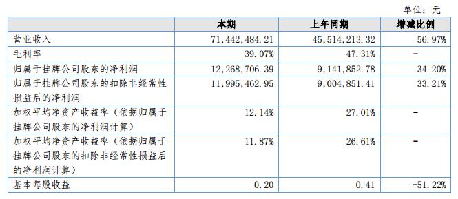 報告期內(nèi)實現(xiàn)營業(yè)收入7,144.25萬元,較上年同期營業(yè)收入增長56.97%,歸屬于母公司股東的凈利潤1,226.87萬元,較上年同期增長34.20%。?