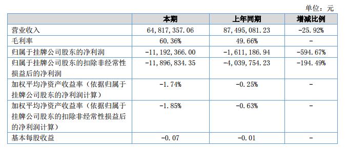 報告期內,公司實現(xiàn)營業(yè)收入64,817,357.06元,上年同期實現(xiàn)營業(yè)收入87,495,081.23元,同比下降25.92%;毛利率由上年同期49.66%上升至本期60.36%;歸屬于掛牌公司股東的凈利潤-11,192,366.00元,上年同期歸屬于掛牌公司股東的凈利潤為-1,611,186.94元,同比虧損增加594.67%。?