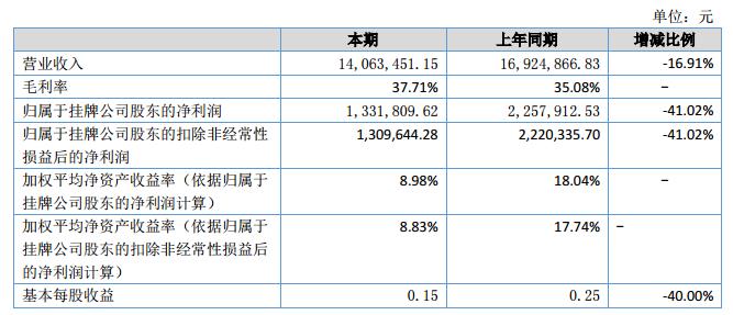 報告期內(nèi),公司實現(xiàn)營業(yè)收入14,063,451.15元,比去年同期降低16.9%;凈利潤1,331,809.62元,同比上期同期降低41.02%。截止2018年6月30日,公司總資產(chǎn)29,072,174,16元,凈資產(chǎn)15,243,551.9元。?