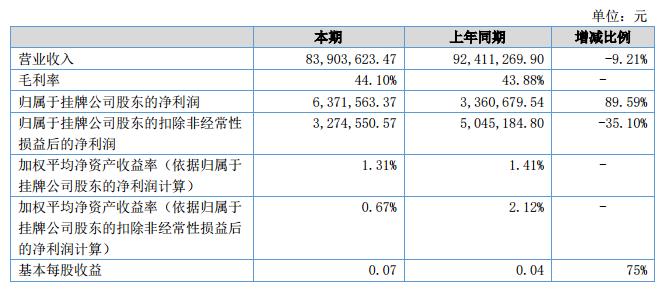 報(bào)告期內(nèi),公司實(shí)現(xiàn)83,903,623.47元的收入規(guī)模,公司管理層按照董事會(huì)制定的戰(zhàn)略規(guī)劃和經(jīng)營(yíng)計(jì)劃,公司堅(jiān)持以市場(chǎng)為導(dǎo)向,通過(guò)提升服務(wù)質(zhì)量,促進(jìn)主營(yíng)業(yè)務(wù)的穩(wěn)健發(fā)展。2018年1-6月,公司實(shí)現(xiàn)營(yíng)業(yè)收入83,903,623.47元,與去年同期92,411,269.91元相比,略有下降。公司實(shí)現(xiàn)歸屬于掛牌公司股東的凈利潤(rùn)6,371,563.37元,較去年同期3,360,679.54元,有一定幅度提升。?