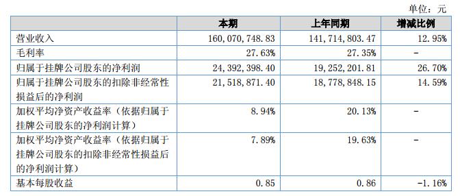 報(bào)告期內(nèi)實(shí)現(xiàn)營(yíng)業(yè)收入160,070,748.83元,同比增長(zhǎng)12.95%,實(shí)現(xiàn)凈利潤(rùn)24,392,398.40元,同比增長(zhǎng)26.70%,主要是公司通過積極根據(jù)客戶需求研發(fā)新產(chǎn)品,調(diào)整產(chǎn)品結(jié)構(gòu)。相比上年同期增加了大健康類業(yè)務(wù),實(shí)現(xiàn)收入6,535,441.88元。?