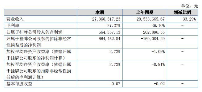 報(bào)告期內(nèi),公司實(shí)現(xiàn)營(yíng)業(yè)收入2,736.83萬元,較2017年同期上升683.47萬元,同比上升33.29%,主要原因系公司所處激光類產(chǎn)品行業(yè)景氣度提升,公司產(chǎn)品需求增加,公司產(chǎn)品的生產(chǎn)和發(fā)貨量增長(zhǎng),導(dǎo)致收入增加所致歸屬于母公司股東的凈利潤(rùn)66.44萬元,較2017年同期上升86.73萬元。?