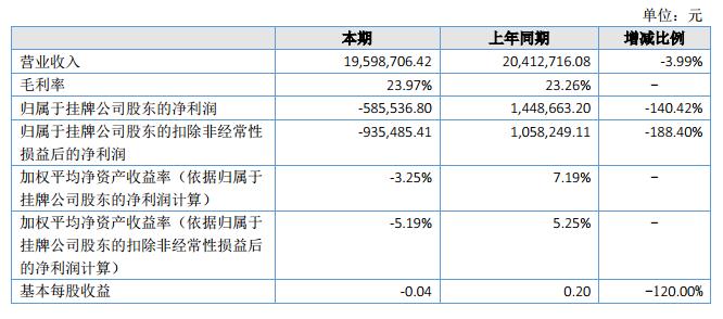 2018年上半年,公司實現(xiàn)營業(yè)收入19,598,706.42元,較上年同期減少814,009.66元,同比下降3.99個百分點,主要原因是市場競爭加劇,公司為保持市場占有率,產(chǎn)品價格小幅下調,受此影響銷售收入同比下降。2018年上半年實現(xiàn)凈利潤-585,536.80元,同比減少2,034,200.00元。?
