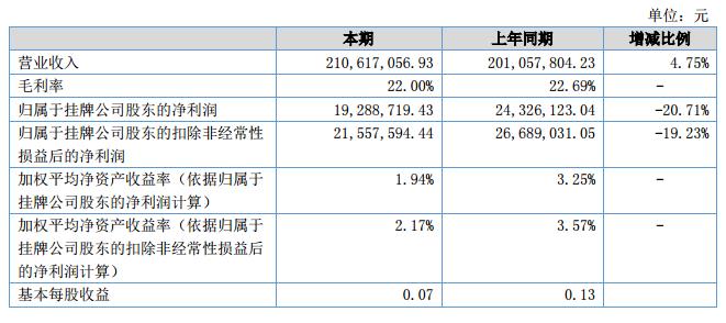 報(bào)告期內(nèi),公司資產(chǎn)總額為1,301,373,222.62元,負(fù)債總額200,246,355.86元,資產(chǎn)負(fù)債率15.39%,歸屬于母公司所有者凈資產(chǎn)總額1,001,608,213.27元。實(shí)現(xiàn)營業(yè)收入210,617,056.93元,同比增長4.75%;營業(yè)成本164,281,943.14元,同比增加了5.69%;毛利率22.00%;凈利潤27,520,033.66元。報(bào)告期內(nèi),公司財(cái)務(wù)狀況總體保持穩(wěn)定。?
