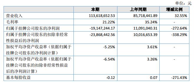 公司在報(bào)告期內(nèi)的主營業(yè)務(wù)收入為113,618,652.53元,同比上年度增長32.55%;營業(yè)成本為89,513,290.01元,同比上年度增長61.26%;歸屬于母公司的凈利潤為-19,147,244.17元,同比上年變動(dòng)率為-272.64%。?