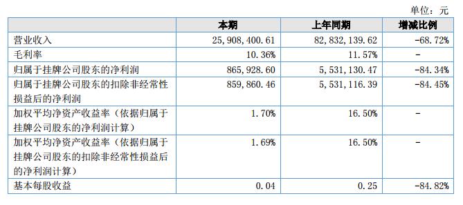 2018年上半年實現(xiàn)營業(yè)收入2,590.84萬,較去年同期減少68.72%,實現(xiàn)凈利潤86.59萬元,較去年同期減少84.34%。?