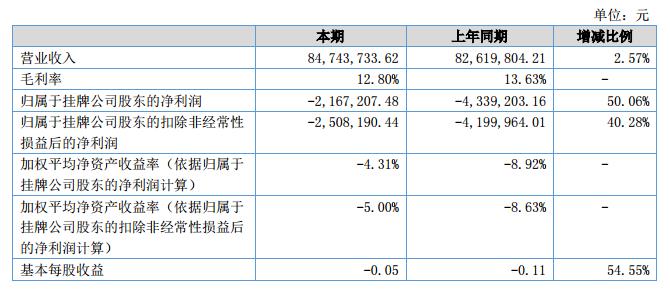 報(bào)告期內(nèi),公司實(shí)現(xiàn)營(yíng)業(yè)收入84,743,733.62,較上年同期增長(zhǎng)2.57%,營(yíng)業(yè)成本73,893,570.33,較上年同期增長(zhǎng)3.55%,凈利潤(rùn)-2,167,207.48,較上年同期增長(zhǎng)50.06%,經(jīng)營(yíng)活動(dòng)產(chǎn)生的現(xiàn)金流量?jī)纛~58,801,552.85,較上年同期增長(zhǎng)288.31%。?