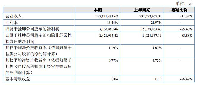 報(bào)告期內(nèi),公司實(shí)現(xiàn)營(yíng)業(yè)收入263,811,481.68元,上年同期營(yíng)業(yè)收入297,478,662.34元,較上年同期下降11.32%,歸屬于掛牌公司股東凈利潤(rùn)為3,763,880.46元,較上年同期下降75.46%。?