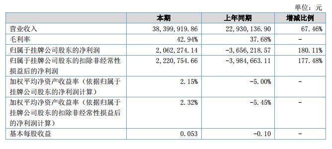 報(bào)告期內(nèi),公司實(shí)現(xiàn)營(yíng)業(yè)收入38,399,919.86元,同比增長(zhǎng)67.46%。主要原因?yàn)?受益公司對(duì)銷售市場(chǎng)的重新布局,積極發(fā)展新的銷售渠道,完善已有銷售模式。報(bào)告期內(nèi),公司產(chǎn)品毛利率42.94%,與去年同期產(chǎn)品毛利率37.68%有較大增長(zhǎng)。主要原因?yàn)椋汗緦?duì)采購市場(chǎng)的價(jià)格上漲的預(yù)判,及時(shí)鎖定了部分材料價(jià)格,避免了材料成本上升帶來成本增加,同時(shí)公司加強(qiáng)了對(duì)生產(chǎn)車間的管理,使生產(chǎn)效率有了大幅提高。報(bào)告期內(nèi),公司的凈利潤(rùn)1,634,033.82元,同比增長(zhǎng)138.28%。主要原因?yàn)?報(bào)告期銷售收入的增長(zhǎng)帶來的毛利貢獻(xiàn)增加,同時(shí)成本費(fèi)用控制到位未出現(xiàn)大幅度變化。?