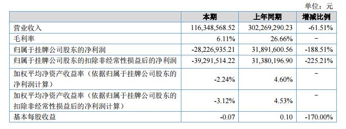 報告期末,我公司實現(xiàn)營業(yè)收入11,634.80萬元,同比下降61.51%;營業(yè)成本10,924.10萬元,同比下降50.72%;凈利潤-2,822.70萬元,同比下降188.51%;經(jīng)營活動產(chǎn)生的現(xiàn)金流量凈額-5,173.80萬元,同比下降1,326.67%。?
