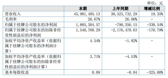 報(bào)告期內(nèi)實(shí)現(xiàn)營業(yè)收入45,981,485.13元,同比增長(zhǎng)19.35%;公司營業(yè)成本33,718,838.50元,同比增長(zhǎng)18.37%;銷售費(fèi)用為2,550,867.25元,同比增加416133.38元。財(cái)務(wù)費(fèi)用593,809.12元,同比增加136,481.31元;公司實(shí)現(xiàn)歸屬于掛牌公司股東的凈利潤1,885,304.57元,同比增長(zhǎng)338.54%,主要是公司積極拓展市場(chǎng),提高了產(chǎn)品的銷量,營業(yè)收入同比增加了19.35%。?