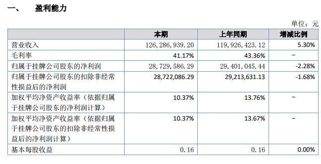 報告期內(nèi),公司實現(xiàn)收入 126,286,939.2,較去年同期 119,926,423.12 增長 5.30%,實現(xiàn)凈利潤 28,729,586.29,較去年同期 29,361,014.97 減少 2.15%;報告期毛利率 41.17%;公司總資產(chǎn)為 319,465,764.11,較年初 303,635,178.39 增長 5.21%。
