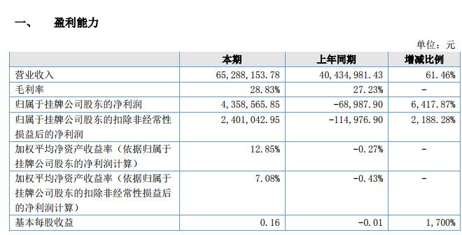 報告期內,公司資產總額 222,079,050.32 元,較年初增加 3,448,903.07 元,增幅 1.58%;本期負債總額為 185,967,897.89 元,較年初減少 909,622.78 元,減幅 0.49%;本期凈資產總額 36,111,152.43 元,較年初增加 4,358,565.85 元,增幅 13.73%;本期營業(yè)收入 65,288,153.78 元,較上年同期增加 24,853,172.35 元,增幅 61.46%;本期營業(yè)成本 46,467,082.87 元,較上年同期增加 17,041,153.98 元,增幅 57.91%,本期凈利潤 4,358,565.85 元,較上年同期增加 4,427,553.75 元,增幅 6,417.87%,本期經(jīng)營活動產生的現(xiàn)金流量凈額 21,269,168.07 元,較上年同期增加 12,733,523.51 元,增幅 149.18%。