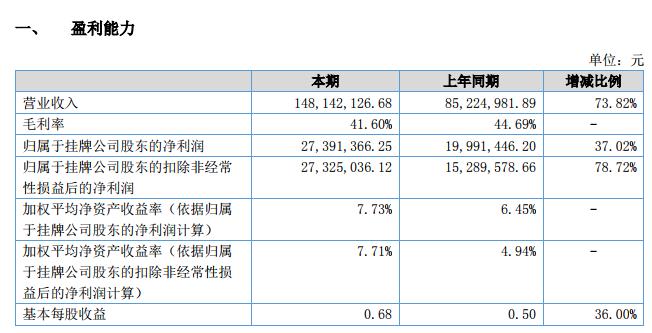 報(bào)告期內(nèi),公司實(shí)現(xiàn)營(yíng)業(yè)收入 148,142,126.68 元,同比增長(zhǎng) 73.82%,主要原因系受?chē)?guó)家環(huán)保政策影響,公司訂單增長(zhǎng)所致;凈利潤(rùn) 27,429,292.60 元,同比增長(zhǎng) 38.48%,主要原因系報(bào)告期內(nèi)公司營(yíng)業(yè)收入增長(zhǎng)所致;截至 2018 年 6 月 30 日,公司總資產(chǎn)為 535,685,773.93 元,同比增長(zhǎng) 2.94%,歸屬于掛牌公司股東的凈資產(chǎn) 366,020,765.74 元,同比增長(zhǎng) 6.83%;經(jīng)營(yíng)活動(dòng)產(chǎn)生的現(xiàn)金流量金額 -21,713,628.08,同比減少-1,264.85%,主要原因系隨著營(yíng)業(yè)收入及訂單增加,公司存貨、采購(gòu)需求增加,支付貨款增加,同時(shí)受回款周期和安裝進(jìn)度的影響,公司銷(xiāo)售回款未同比例增加所致。報(bào)告期內(nèi),公司不斷加強(qiáng)研發(fā)隊(duì)伍建設(shè),引進(jìn)創(chuàng)新性人才,提高工藝水平,繼續(xù)保持行業(yè)領(lǐng)