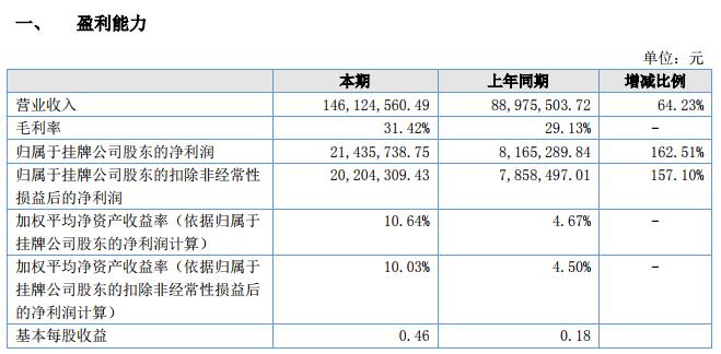 上半年實現(xiàn)營業(yè)收入 14,612.46 萬元,比上年同期 8,897.55 萬元增長 64.23%,實現(xiàn)產(chǎn)品毛利 4,591.23 萬元,毛利率 31.42%,實現(xiàn)歸屬于掛牌公司股東的凈利潤 2,143.57 萬元,比上年同期 816.53 萬元增長 162.51%。