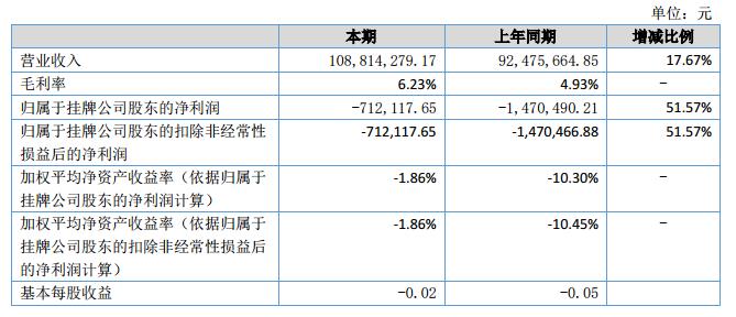 報(bào)告期內(nèi),公司實(shí)現(xiàn)營(yíng)業(yè)收入108,814,279.17元,較去年同期營(yíng)業(yè)收入增加17.67%,營(yíng)收的增長(zhǎng)主要得益于公司在保持銷售穩(wěn)步增長(zhǎng)的前提下,配合產(chǎn)品結(jié)構(gòu)的調(diào)整,適合市場(chǎng)的需求。本期毛利率6.23%,上年同期毛利率4.93%,上升26.36%。?