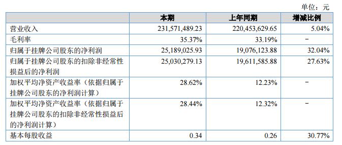 報(bào)告期內(nèi),公司實(shí)現(xiàn)營(yíng)業(yè)收入231,571,489.23元,較去年同期增長(zhǎng)5.04%;凈利潤(rùn)25,189,025.93元,較去年同期增長(zhǎng)32.04%;公司總資產(chǎn)期末為514,357,885.46元,較上年期末增長(zhǎng)4.80%。?