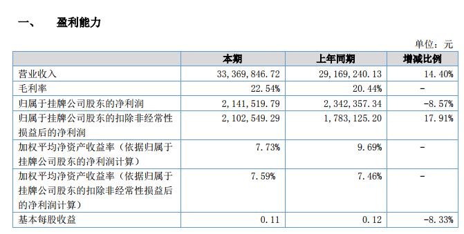 在報告期內(nèi),公司 2018 年 1-6 月實現(xiàn)營業(yè)收入 33,369,846.72 元,比上年同期增長 14.40%;2018 年 1-6 月實現(xiàn)利潤總額 2,952,952.48 元,比上年同期增長 8.58%;公司總資產(chǎn)為 48,425,646.30 元,凈資產(chǎn)為 28,772,966.52 元,較上期期末相比均有小幅增長,以上數(shù)據(jù)表明,公司財務狀況及盈利水平較上期水平平均均有較大提升。