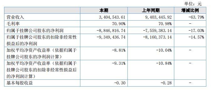 報(bào)告期內(nèi),營業(yè)收入340.45萬元,同比下降63.79%,營業(yè)利潤是-960.64萬元,同比去年同期下降了20.23%,歸屬于公司股東的凈利潤-884.68萬元,同比下降17.03%。?