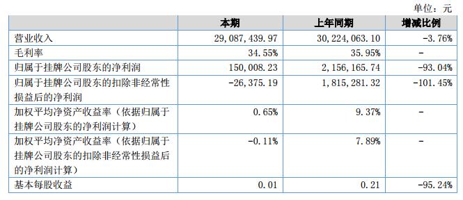 公司2018年上半年度實現(xiàn)為營業(yè)收入2,908.74萬元,較上年同期下降了3.76%;實現(xiàn)凈利潤15.00萬元,較上年同期下降了93.04%,凈利潤下降的主要是同比營業(yè)收入減少、銷售費用增加等原因引起的。扣除非經(jīng)常性損益后的凈利潤為-2.64萬元,較上年同期下降了101.45%。報告期末總資產(chǎn)4,588.19萬元,總資產(chǎn)增長率為9.00%;凈資產(chǎn)2,320.01萬元,凈資產(chǎn)的增長率為0.65%;經(jīng)營活動產(chǎn)生的現(xiàn)金流量凈額69.29萬元,比去年同期下降88.97%。?