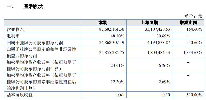 報告期內,公司實現(xiàn)營業(yè)收入 87,602,161.30 元,較上年同期增長 164.60%,為產品銷量增加所致。實現(xiàn)凈利潤 26,868,307.19 元,較上年同期增長 540.66%,為產品整體毛利率提升所致。經營活動產生的現(xiàn)金流量凈額 23,822,253.45 元,較上年同期增長 245.15%,系銷售商品收到的現(xiàn)金增加所致。