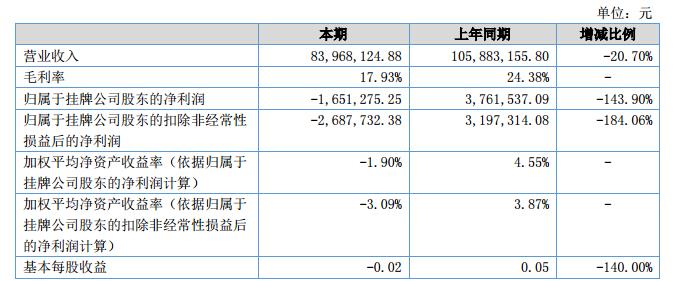 挖貝網(wǎng)9月18日,美佳樂(證券代碼:871514)近日公布的2018年半年報顯示,截至2018年6月30日,企業(yè)實現(xiàn)營收8396.81萬元;歸屬于掛牌公司股東的凈利潤為-165.12萬元。