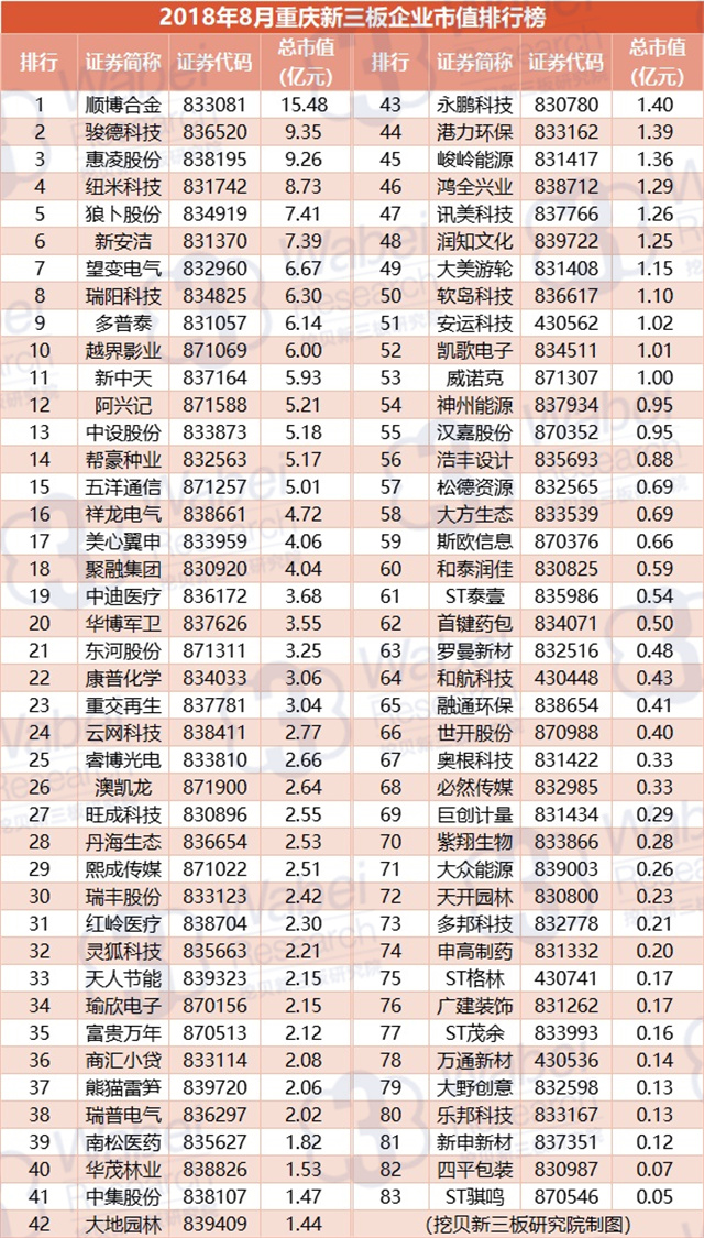 附:2018年8月重慶新三板企業(yè)市值排行榜