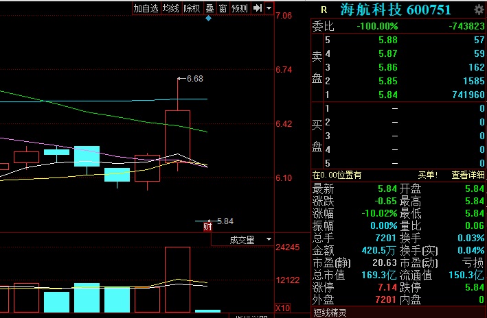 今天是長達(dá)8個月停牌后航海科技的第一個交易日,開盤即遭遇跌停,直至收盤。全天共成交7201手,成交額為420.5萬,換手率僅0.03%。截至收盤,海航科技報收于5.84元,跌幅為10.02%,封單超74萬手。