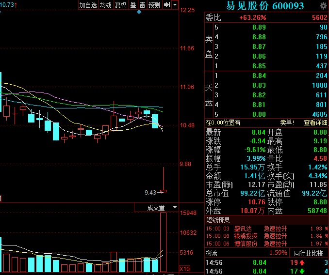 9月28日,易見(jiàn)股份跳空下跌,最終報(bào)收于8.84元/股,跌9.61%。成交量15.95萬(wàn)手,是昨成交量的近五倍。