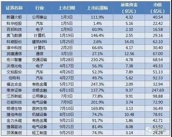統(tǒng)計顯示,20家新三板公司,通過首次公開發(fā)行,合計募資122億元(凈額),融資最多的科順股份14億元,最少的金力永磁也有1.86億元。