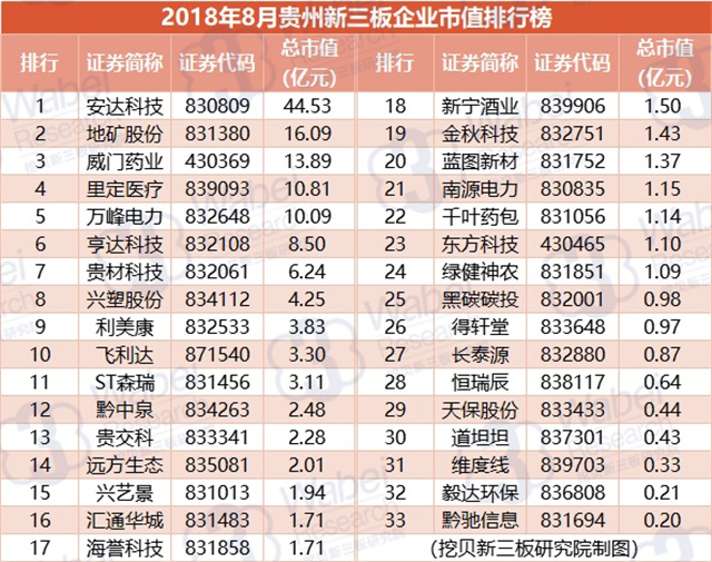 附:2018年8月貴州新三板企業(yè)市值排行榜