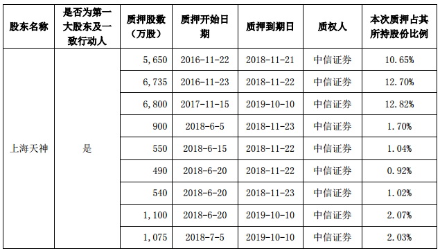 這已經(jīng)是上海天神對持有天順風能股份的第13次質(zhì)押。截至目前,上海天神持有天順風能股份5.30億股,占公司總股本的29.81%,是公司的控股股東。2016年11月以來,上海天神共對持有天順風能的股份進行了13次質(zhì)押,共質(zhì)押了3.65億股,累計質(zhì)押股份占其所持股份的比例高達68.85%,占天順風能總股本的20.52%。13次質(zhì)押的到期日均在今年11月以后。