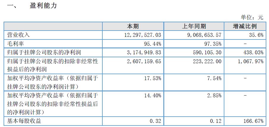 報告期末,公司總資產為2238.85 萬元,較上年同期(2017.6.30)增加1064.01 萬元;營業(yè)收入達到1229.75 萬元,較上年同期增長322.89 萬元;凈利潤317.49 萬元,較上年同期增加258.48 萬元;經營活動產生的現金流量凈額為-133.58 萬元,較上年同期增加 -120.26 萬元。
