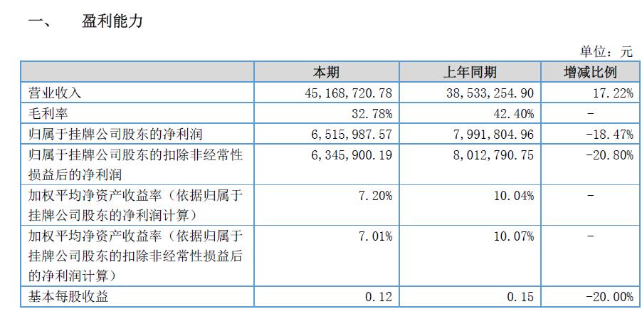 報告期內(nèi)實現(xiàn)營業(yè)收入45,168,720.78 元,同比增長17.22%,營業(yè)成本30,363,278.37 元,同比增長36.81%,凈利潤6,515,987.57 元,同比減少18.47%。