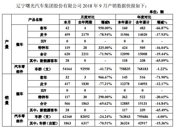 挖貝網(wǎng)訊 10月9日消息,曙光股份(600303)公布了9月產(chǎn)銷數(shù)據(jù)快報(bào),9月份,整車產(chǎn)量同比下滑了71.96%,整車銷量同比下滑了69.62%。值得注意的是,9月,曙光股份的重點(diǎn)車型皮卡車產(chǎn)量、銷量均同比下滑,幅度超70%。