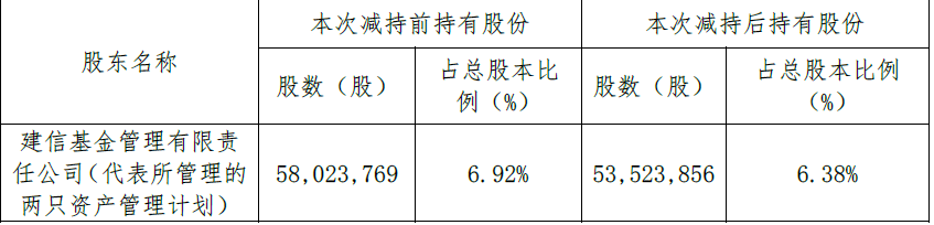 資料顯示,建信基金在減持前持股5800萬股,占公司比例6.92%,減持后持股53,523,856股,占公司比例6.38%。