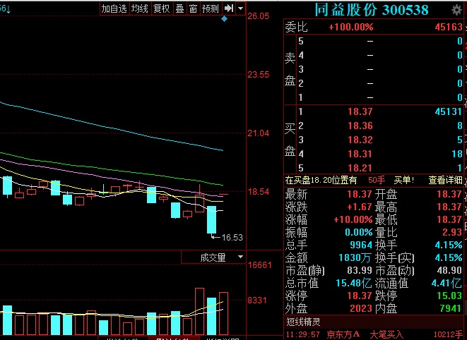 昨日,滬深大盤齊跌超5%,創(chuàng)下兩年半以來最大跌幅。今日午時(shí)收盤,上證指數(shù)下跌0.12%,深證成指下跌0.32%,同益股份逆勢漲停。截至午時(shí)收盤,同益股份報(bào)收于18.37元/股,暫收一字板漲停,封單4.5萬手。