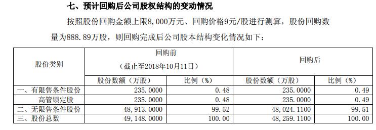據(jù)介紹,本次回購(gòu)金額不低于3000萬(wàn)元且不超過(guò)8000萬(wàn)元。按照不超過(guò)9元/股計(jì)算,回購(gòu)的股票數(shù)量在333.33萬(wàn)股和888.89萬(wàn)股之間,占公司總股份0.6782%至1.8086%?;刭?gòu)方案自股東大會(huì)審議通過(guò)回購(gòu)股份方案之日起6個(gè)月內(nèi)執(zhí)行完畢。