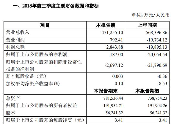 2018年1-9月,公司實(shí)現(xiàn)營業(yè)收入47.12億元,與去年同期相比下降17.09%;利潤總額2844萬元,同比減少虧損約22,739萬元。