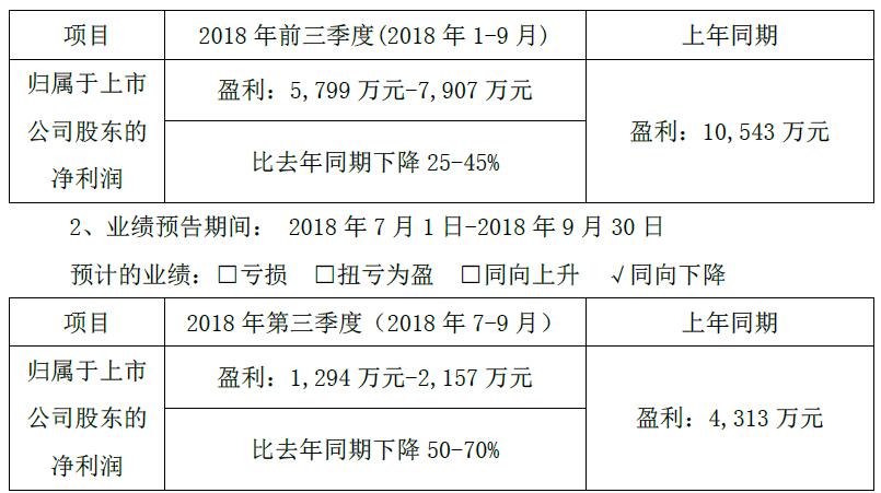 1-9月份,利潤(rùn)為5799萬元-7907萬元,去年同期為1.05億元,比去年同期下降25-45%。
