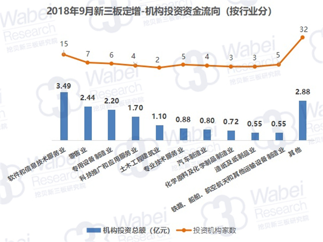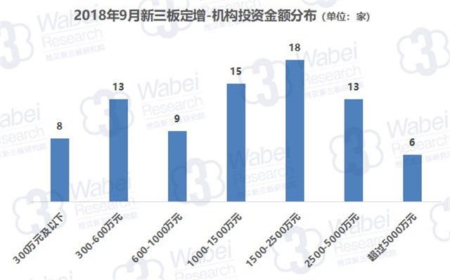 2018年9月,新三板企業(yè)共定增募資34.65億元,其中,機(jī)構(gòu)對(duì)企業(yè)投資17.30億元,環(huán)比降30%。機(jī)構(gòu)投資總額占新三板企業(yè)募資總額的50%。