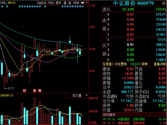 今明兩天,張永宏護衛(wèi)股價任務(wù)艱巨。今日,中弘股份0.92元/股開盤,漲1.10%