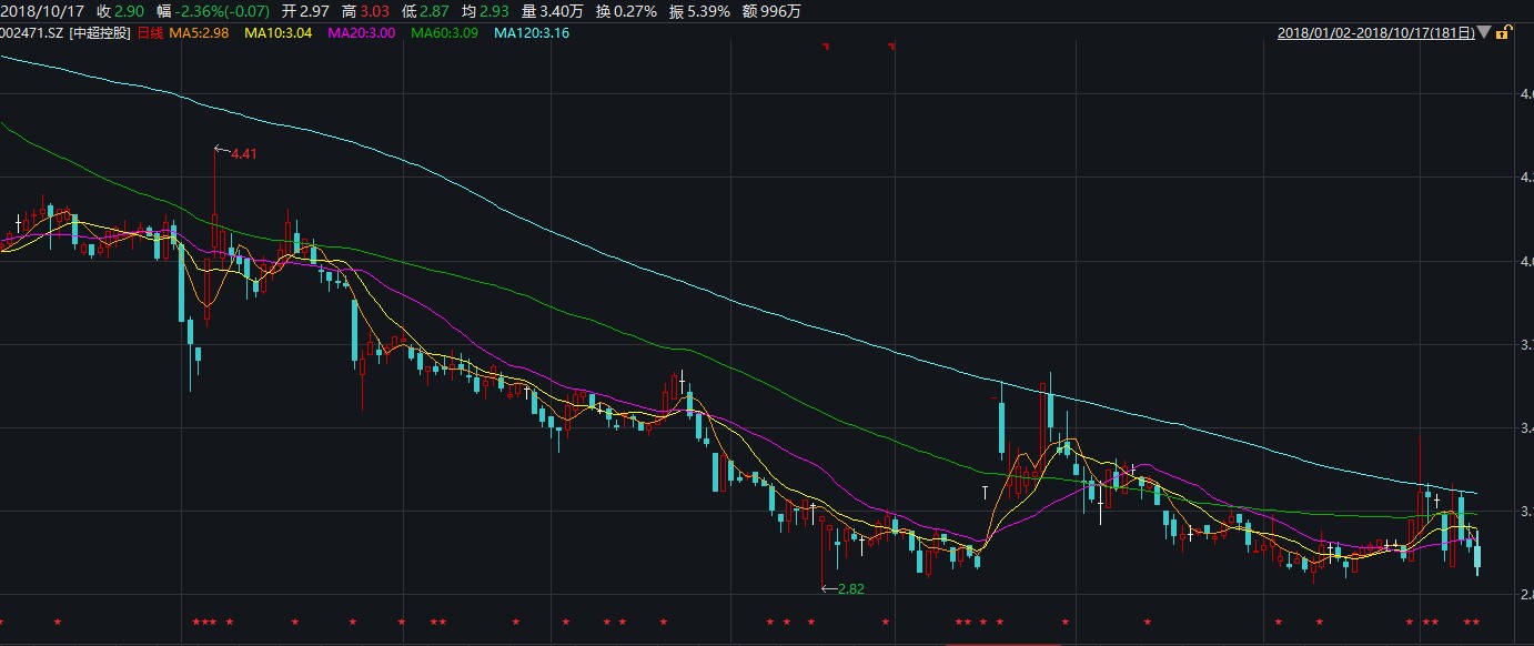 受此影響,截止10月17日上午10時50分許,中超控股股價報2.9元/股,跌幅2.4%,已經(jīng)接近其年內(nèi)最低價2.82元/股。